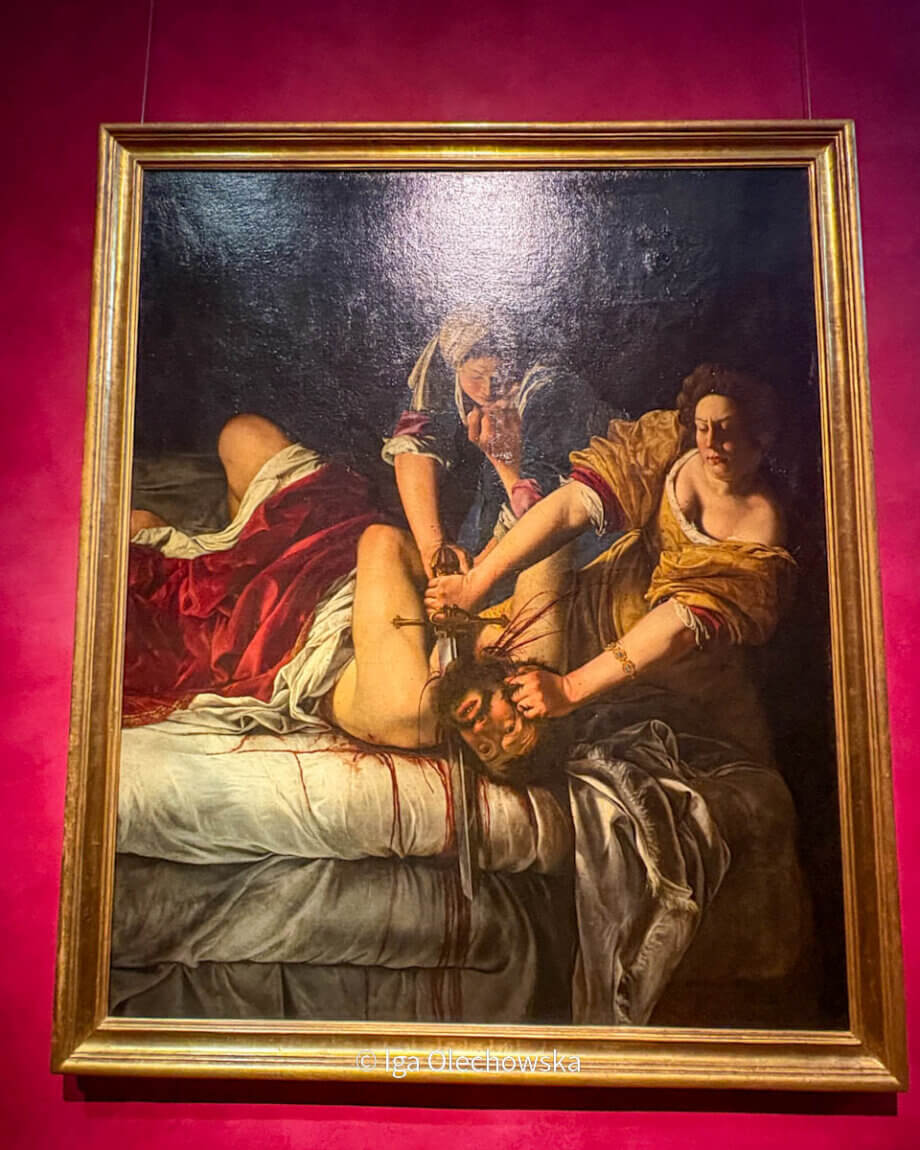 Na obrazie znajdującym się w Galerii Uffizi (ok. 1620 r.) Artemisia Gentileschi ukazała dramatyczny moment zabójstwa Holofernesa przez odważną i zdeterminowaną Judytę. Według biblijnej historii Judyta udała się do obozu Holofernesa, dowódcy wrogiej armii i podstępem zadała mu śmiertelny cios.