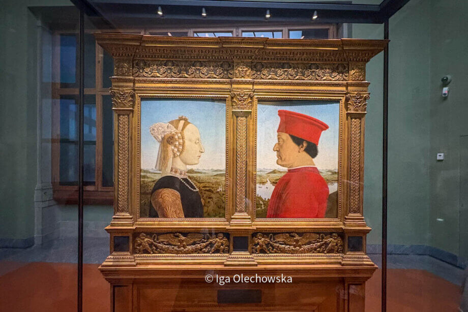 Ten dyptyk jest jednym z najbardziej znanych portretów włoskiego renesansu. Przedstawia władcę Urbino, Federica da Montefeltro, oraz jego żonę Battistę Sforzę. Oboje zostali ukazani z profilu, co pozwoliło artyście dokładnie oddać ich rysy twarzy, jednocześnie nie pokazując emocji. Postacie sprawiają wrażenie spokojnych i powściągliwych. Książę i księżna stoją naprzeciw siebie, a wspólna przestrzeń obrazu została podkreślona przez to samo światło oraz ciągłość krajobrazu w tle. Widoczny pejzaż przedstawia pagórkowate tereny regionu Marche, nad którym panowała rodzina Montefeltro. Wyraźny kontrast między ciemniejszą cerą Federica a bardzo jasną twarzą Battisty zwraca uwagę widza. Bladość księżnej była zgodna z ideałami piękna epoki, ale może także nawiązywać do jej przedwczesnej śmierci.