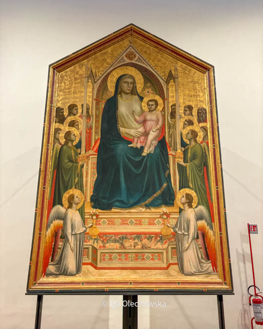 Obraz przedstawia Maryję siedzącą na tronie z Dzieciątkiem Jezus na kolanach. Wokół nich znajdują się aniołowie i święci. Taki sposób ukazania Maryi nazywa się Maestà i pokazuje ją jako Królową Nieba. Jezus prawą ręką błogosławi, a w lewej trzyma zwinięty pergamin, który jest znakiem mądrości. Tron przypomina kamienną budowlę i nawiązuje do gotyckich kościołów z tamtych czasów. Aniołowie klęczący u stóp tronu trzymają wazony z różami i liliami. Kwiaty te symbolizują czystość i miłość. Na obrazie widzimy także świętych, ponieważ dzieło zostało namalowane dla Kościoła Wszystkich Świętych we Florencji. Obraz miał zdobić ołtarz i służyć modlitwie.