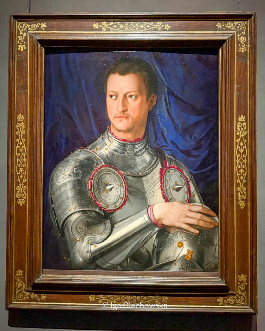 Cosimo I Medyceusz, książę Florencji i wielki książę Toskanii, urodzony 12 czerwca 1519 roku, został ukazany w ujęciu do pasa, zwrócony twarzą do widza. Jego sztywna postawa i spokojne, dumne spojrzenie wyrażają siłę i pewność siebie. Zbroja, w której został przedstawiony, podkreśla jego rolę jako władcy i dowódcy wojskowego. Bronzino był oficjalnym portrecistą dworu Medyceuszy. Tworzył reprezentacyjne i uroczyste wizerunki członków rodu, z których wiele można dziś oglądać w Galerii Uffizi. Jego portrety łączą realizm z idealizacją, co czyni je jednymi z najważniejszych przykładów sztuki manieryzmu.