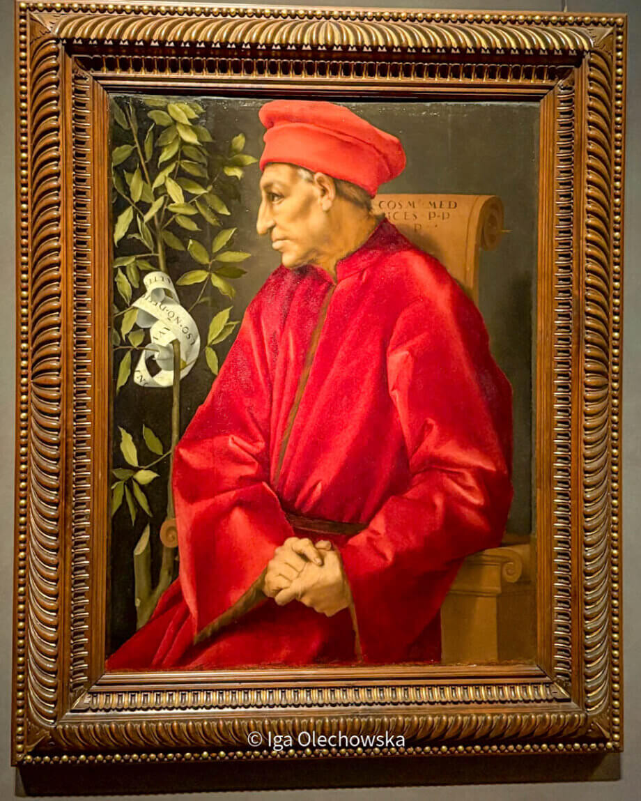 Ten pośmiertny portret został zamówiony u Pontorma przez Goro Goriego z Pistoi, prawdopodobnie na polecenie papieża Leona X, urodzonego jako Giovanni de’ Medici. Cosimo został ukazany z profilu, zgodnie z wizerunkami znanymi z medali wybitych po 1465 roku, kiedy oficjalnie nadano mu tytuł Pater Patriae. Czerwona aksamitna peleryna i nakrycie głowy nawiązują do strojów świętych Kosmy i Damiana, patronów rodu Medyceuszy. Po lewej stronie widoczny jest herb Medyceuszy: złamana gałązka laurowa, z której wyrasta nowy pęd – symbol ciągłości rodu. Towarzyszące mu motto głosi, że „złamana gałąź nie osłabia drugiej”. Nawiązuje ono do Eneidy Wergiliusza i wzmacnia przypuszczenie, że obraz powstał dla uczczenia narodzin Cosima I, pierwszego wielkiego księcia Toskanii.