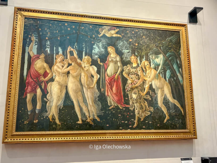Obraz „Wiosna” – znany także jako Primavera – przedstawia dziewięć postaci z mitologii greckiej stojących na ukwieconej łące, na tle gaju drzew pomarańczowych i laurowych. Scena ma charakter spokojny i pełen harmonii. Po prawej stronie widzimy Zefira, boga wiatru, który obejmuje nimfę Chloris. Obok została ona ukazana jako Flora – bogini kwiatów i wiosny, rozsypująca kwiaty. W centrum obrazu znajduje się Wenus, bogini miłości i piękna, ubrana skromnie i spokojnie spoglądająca na widza. Nad nią unosi się Kupidyn z zawiązanymi oczami, który strzela strzałą miłości.