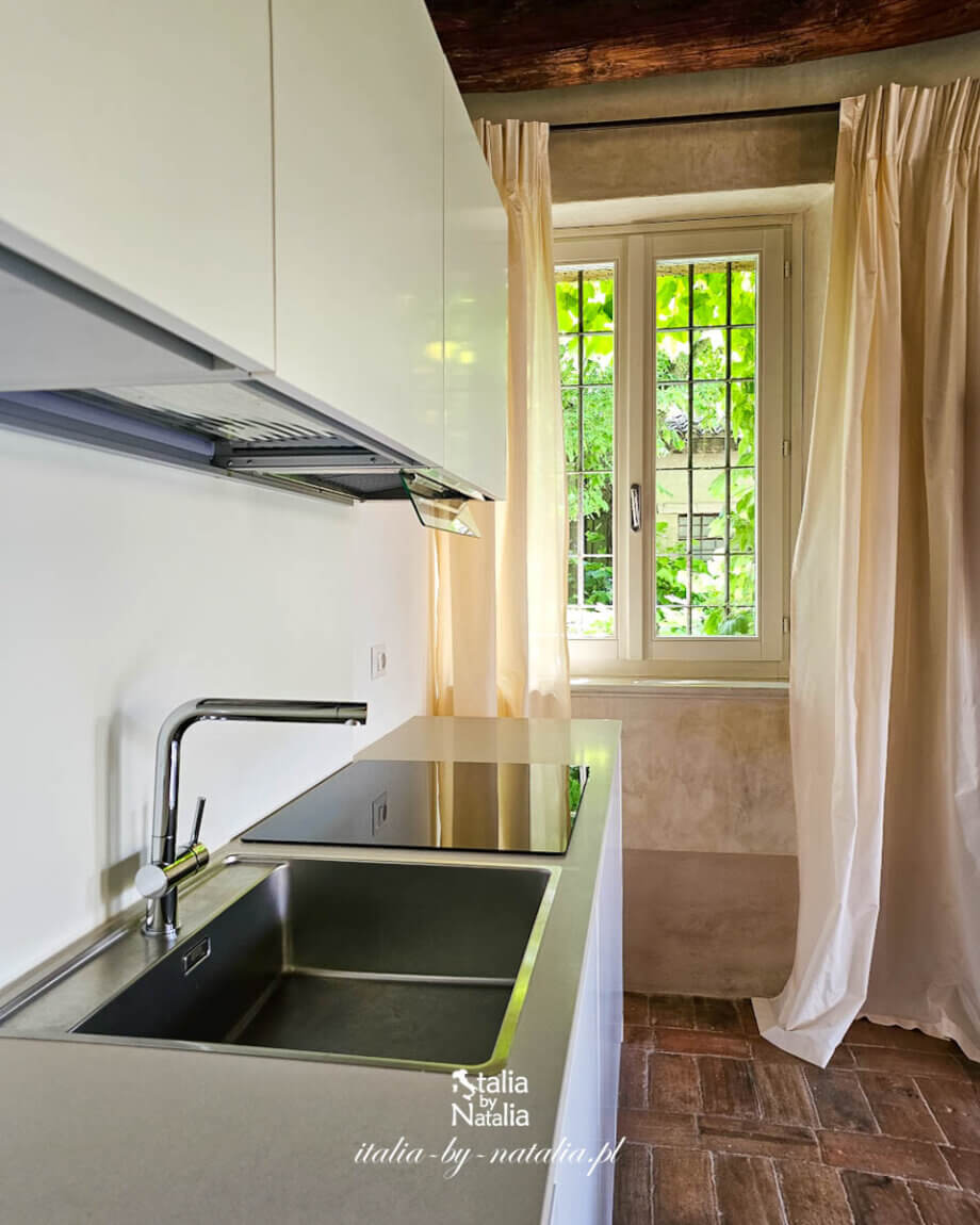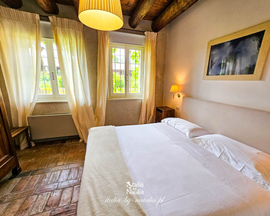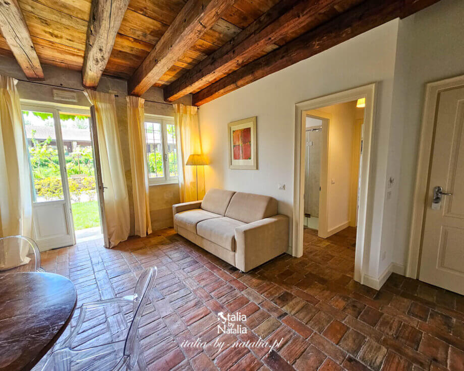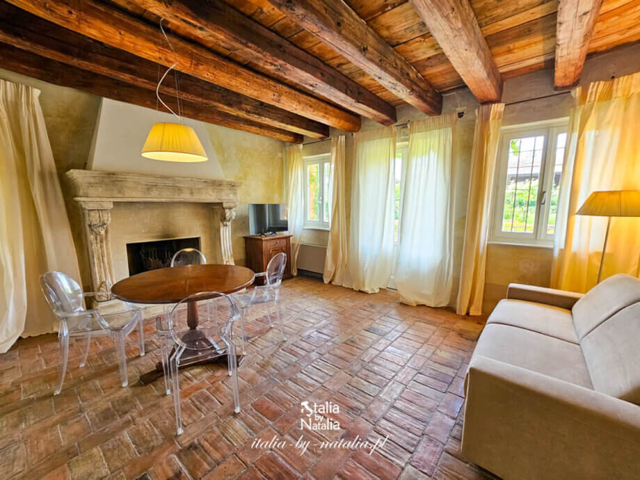 Relais Corte Guastalla oferuje dziś 12 apartamentów, z których część ma własne ogrodowe patio. I właśnie w jednym z takich apartamentów zatrzymaliśmy się na tydzień. Drzwi wejściowe zaprowadziły nas do dużego salonu, którego największą ozdobą jest ogromny, kamienny kominek, będący oryginalnym elementem tego pomieszczenia! Dziś nie jest już używany, więc goście nie mają możliwości rozpalenia w nim ognia, ale mimo to jego majestat wpływa na wyjątkowy klimat tego pomieszczenia.