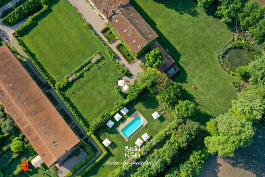Szutrowa droga pośród łąk i winnic prowadzi najpierw koło klubu golfowego, by na jego wysokości skręcić, minąć dwa gospodarstwa rolne i po chwili zatrzymać się już przed wysoką, kutą bramą dwuskrzydłową, osadzoną w starym, kamiennym murze. Po lewej stronie znajduje się słupek z klawiaturą kodową, na której należy wpisać kod. Wszystkie informacje otrzymałam w formie e-maila na kilka dni przed przyjazdem, począwszy od kodu do bramy, numeru miejsca parkingowego (są przydzielone do poszczególnych apartamentów) i kodu do pokoju (tutaj również nie ma tradycyjnych kluczy czy kart), po rekomendacje, np. gdzie w okolicy można kupić najsmaczniejsze cornetti. Właściciele mieszkają w domu na tej samej posesji, ale jednocześnie rozwiązali kwestię zameldowania tak, że nie muszą być obecni w chwili przyjazdu nowych gości.