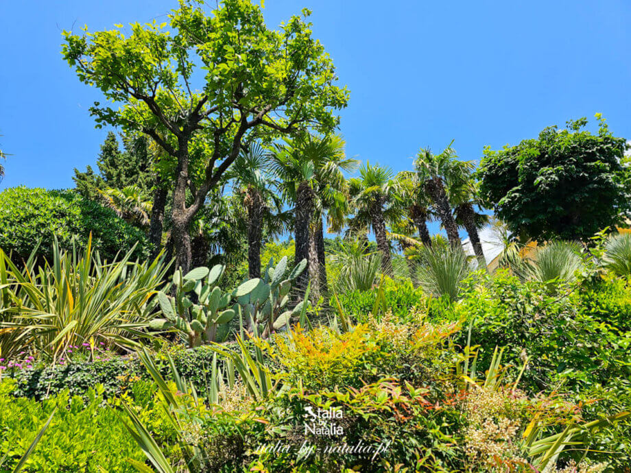 Ścieżki prowadzą pomiędzy wieloma gatunkami roślin – zarówno typowych dla regionu śródziemnomorskiego, takich jak mirty, tamaryszki czy drzewo truskawkowe, jak i egzotycznych, sprowadzanych tu od XIX wieku z różnych części świata, między innymi araukarii czy agaw. Pomiędzy nimi pojawiają się niewielkie skwery z ławkami, tworzące zaciszne miejsca, w których można na chwilę przysiąść i spojrzeć na spokojną taflę wody.