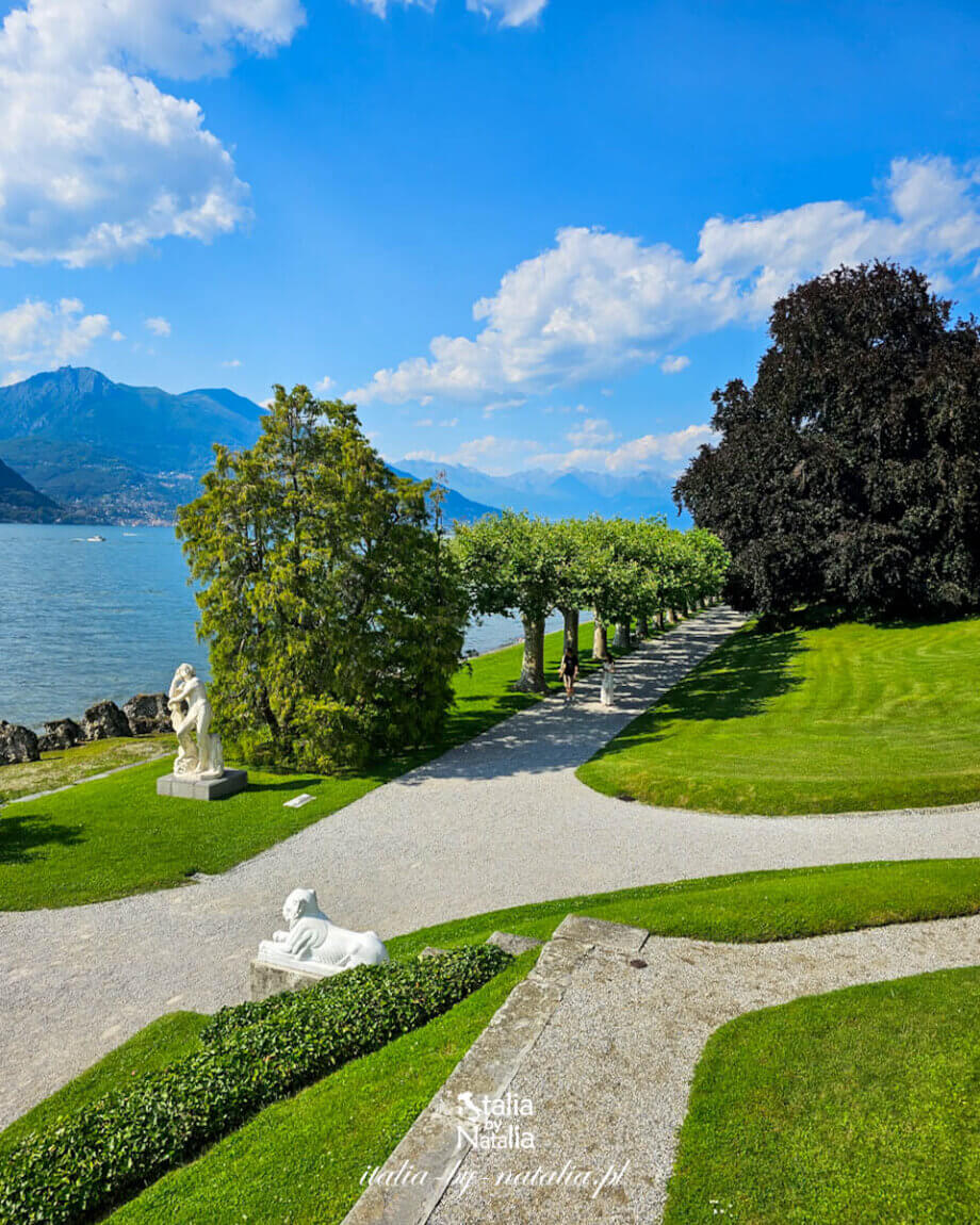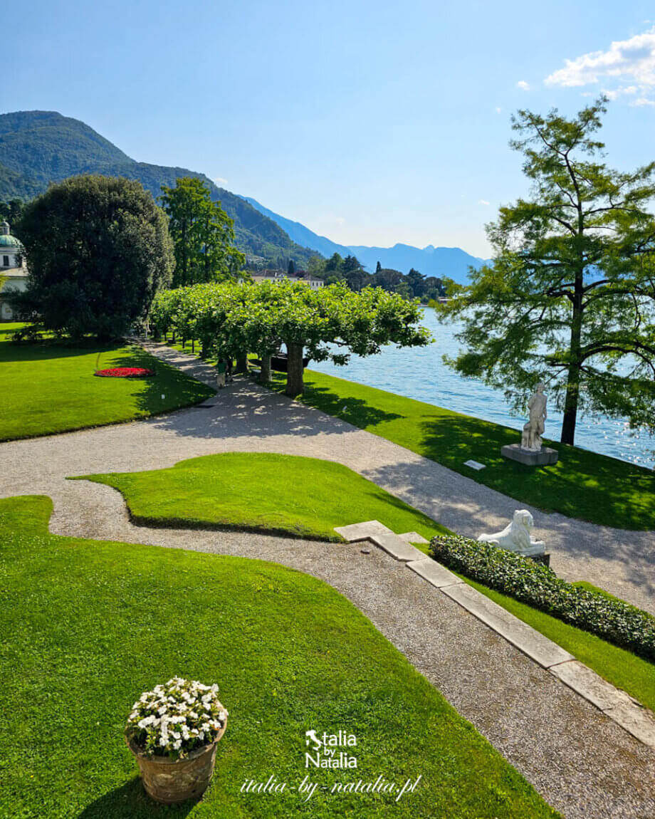 Bellagio, położone na cyplu niemal w samym środku jeziora Como, wraz z pobliską Varennę należy do najczęściej odwiedzanych miejsc nad jeziorem. W słoneczne, letnie dni wąskie uliczki prowadzące z centrum w dół do portu i na promenadę wypełniają się turystami do tego stopnia, że trudno tamtędy przejść, a przy przystani niemal bez przerwy cumują kolejne statki i promy przypływające z innych miejscowości. Wystarczy jednak odejść kilkanaście minut na południe od historycznego centrum, by znaleźć się w zupełnie innym świecie. Tuż za bramą Villa Melzi d’Eril zaczyna się rozległy park, w którym zamiast stromych tarasów pojawiają się szerokie trawniki, stare drzewa i spokojne alejki prowadzące tuż przy brzegu. Z każdym kolejnym krokiem ruch uliczny cichnie, a zamiast gwaru miasteczka pojawia się szum drzew i spokojna tafla jeziora. Do ogrodów trafiliśmy w drugiej dekadzie czerwca, w piękne i bardzo ciepłe popołudnie. Zamiast kierować się najpierw w stronę zatłoczonego centrum Bellagio, zaczęliśmy zwiedzanie właśnie tutaj, licząc na chwilę spokoju zanim miasteczko na dobre wypełni się turystami.