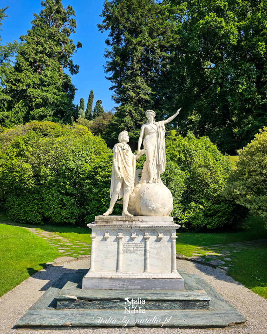 Naprzeciwko pawilonu stoi jedna z najbardziej znanych rzeźb w ogrodach Villa Melzi – pomnik przedstawiający Dantego i Beatrycze. Został wykonany w 1810 roku przez lombardzkiego rzeźbiarza Giovanniego Battistę Comolliego i nawiązuje do sceny z „Boskiej komedii”, w której Beatrycze pociesza Dantego po zapowiedzi jego wygnania z Florencji.