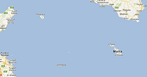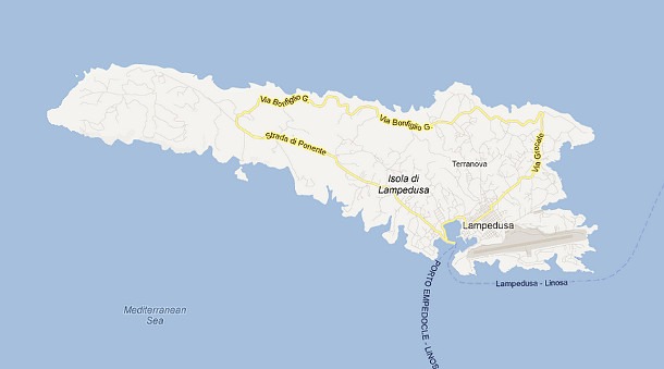 Cytując Wikipedię Lampedusa to „[…]największa z Wysp Pelagijskich o powierzchni 20,2 km². Jej długość wynosi 9 km, a szerokość 3 km. Wysokość n.p.m. sięga 133 m […]”. Poniżej zamieszczam zdjęcia zrobione z Google Maps przedstawiające lokalizację wyspy.